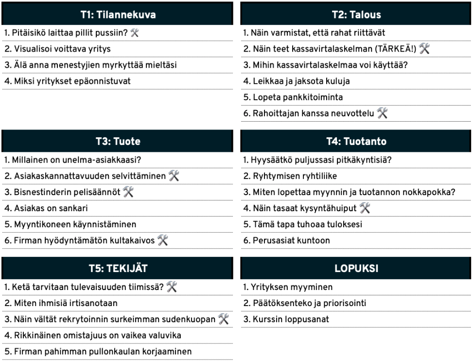 - Kurssilla käytetyt työkalupohjat (esimerkiksi viikkopohjainen kassavirtalaskelmapohja, kuukausipohjainen kassavirtalaskelmapohja, asiakkaiden ABC-lajittelutyökalu, tervehdyttämissuunnitelmaesitys rahoittajalle, sinisen meren strategiakanvaasi, tarjontamatriisi, kapasiteettilaskelma ja core values -työkalu, kaikki videoselityksineen).